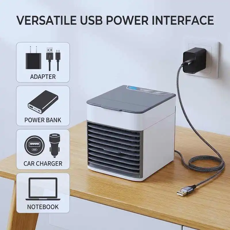 Mini Air Cooler-এর বিদ্যুৎ খরচ অত্যন্ত কম, যা এটিকে একটি এনার্জি-সেভিং ডিভাইসে পরিণত করেছে। এটি 100-240V পাওয়ার সাপোর্ট করে এবং USB 5V 2.1A ইন্টারফেসের মাধ্যমে পাওয়ার ব্যাংক, কার চার্জার বা মোবাইল অ্যাডাপ্টার দিয়েও চালানো যায়। ফলে লোডশেডিং বা বাইরে ব্যবহারেও কোনো সমস্যা হয় না।